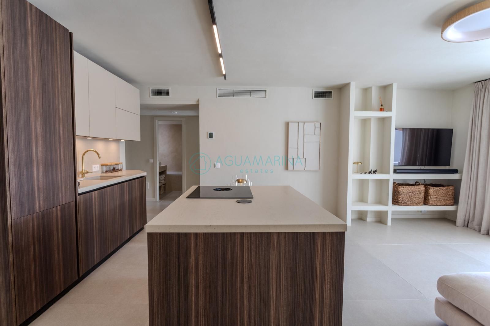 The bathrooms are entirely finished in microcement with built-in fixtures, creating a clean and sophisticated look. Large-format 120×120 tiles have been used throughout the property, seamlessly extending from the interior living areas to the outdoor terraces.