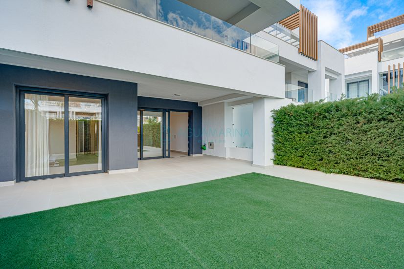 Well-presented east-facing two-bedroom ground floor apartment located in the popular gated community of Miradores del Sol, ideally situated in Cancelada and within close proximity to the beach, shops, restaurants, and all essential amenities. The property offers a comfortable and functional layout, featuring a bright living and dining area with access to the terrace and private garden; a master suite; guest bedroom; guest bathroom; fully fitted kitchen with a separate laundry area; private rear patio; and direct access from the private garden to the communal areas. Residents of Miradores del Sol benefit from excellent communal facilities, including a large swimming pool, two jacuzzis, and a children’s playground, all set within beautifully maintained gardens. Other features include hot and cold air conditioning, underfloor heating throughout, a private parking space, and a storeroom.