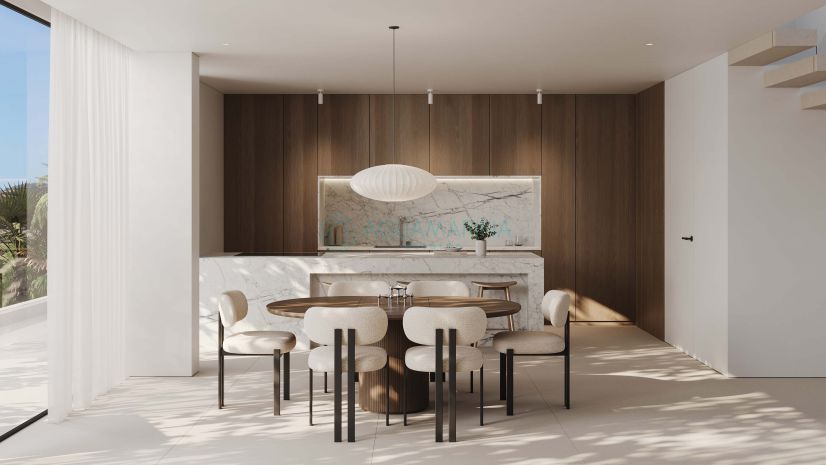 This contemporary masterpiece blends minimalist architecture with luxurious comfort, creating the perfect Mediterranean sanctuary. With floor-to-ceiling windows and open-plan interiors, natural light floods the space, enhancing the serene atmosphere and seamless indoor-outdoor living.